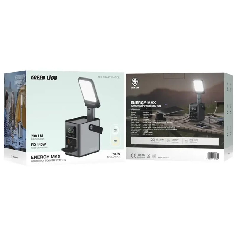 پاور استیشن قابل حمل Green Lion Energy Max 60000mAh 230W یکی از کاملترین و قدرتمندترین منابع تغذیه قابل حمل است که برای استفاده در فضای باز، شرایط اضطراری، سفر و کمپینگ طراحی شده است. این دستگاه با باتری قدرتمند 60000 میلیآمپرساعت، توان تأمین انرژی همزمان چند دستگاه را دارد.