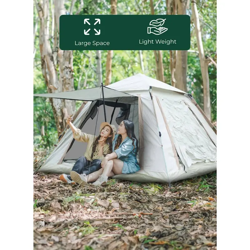 با ابعاد ۲۴۰ × ۲۴۰ × ۱۵۵ سانتیمتر، ای چادر فضای قابلتوجهی فراهم میکند و امکان پذیرایی از ۵ تا ۶ نفر را در سفرهای گروهی، خانوادگی یا اردوهای دوستانه به راحتی دارد. فضای گستردهی داخلی، امکان قرار دادن تجهیزات کمپینگ، کیسهخواب و لوازم جانبی را بدون ایجاد حس شلوغی فراهم میسازد.