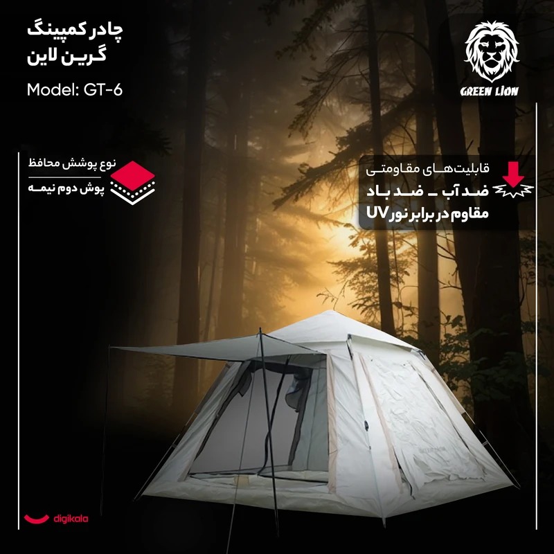 یکی از نقاط قوت Green Lion GT-6، بهرهمندی از سیستم نصب خودکار است. این قابلیت باعث میشود چادر تنها در چند دقیقه آمادهی استفاده شود؛ ویژگیای که در شرایط اضطراری، بارش باران یا هنگام خستگی پس از پیادهرویهای طولانی، بسیار ارزشمند است.