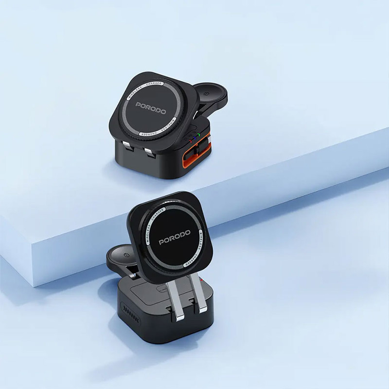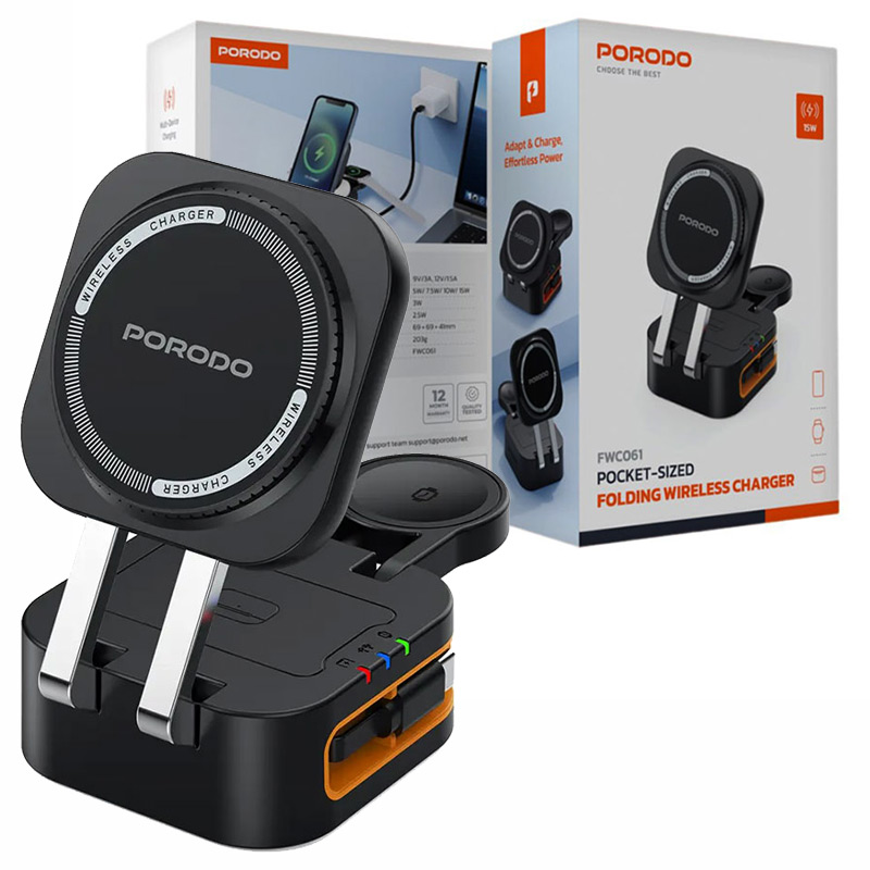 اگر به دنبال یک شارژر بیسیم سبک، مدرن و همهمنظوره هستید که بتواند همزمان گوشی، هدفون و ساعت هوشمند شما را شارژ کند، استند شارژ وایرلس مگسیف تاشو 3 کاره پرودو Porodo Pocket Sized FWC061 انتخابی ایدهآل است. با این شارژر، همیشه انرژی در دستان شماست چه در سفر، چه در محل کار و چه در زندگی روزمره.
