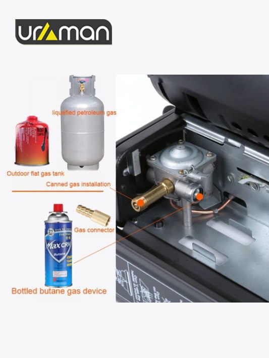 سازگاری با گاز بوتان ۲۲۰ گرمی و گاز پیک نیکی و گاز ۱۱ کیلوگرمی به وسیله ی شلنگ و رابط و رگلاتور