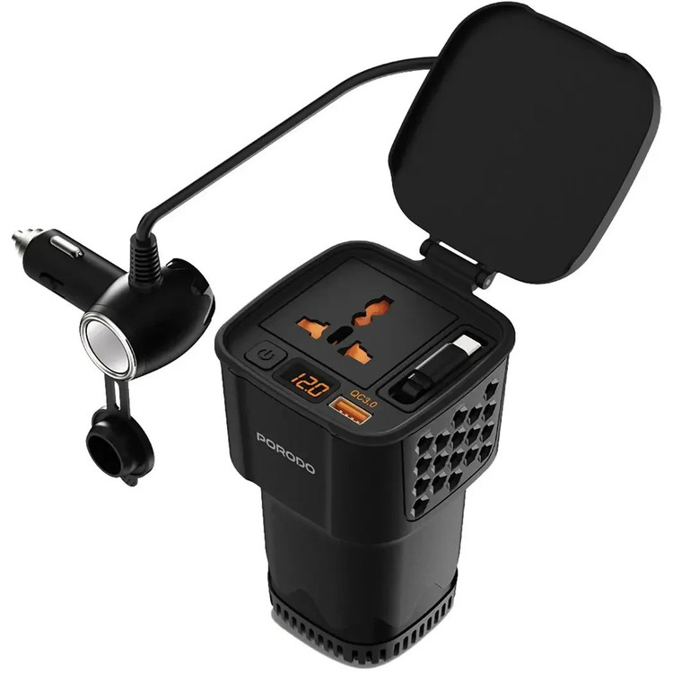 اینورتر برق خودرو Porodo DriveStation 200W با نمایشگر ولتاژ لحظهای – مشکی یک منبع تغذیه قابلاعتماد برای استفاده در سفر و داخل خودرو است.