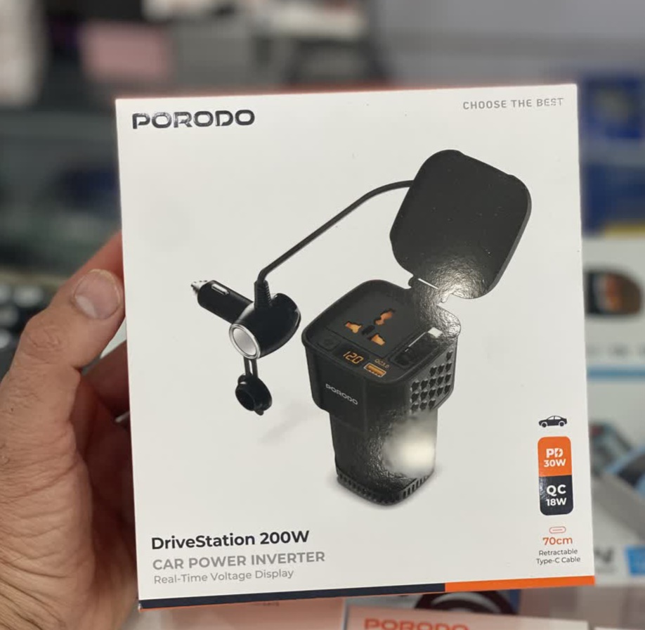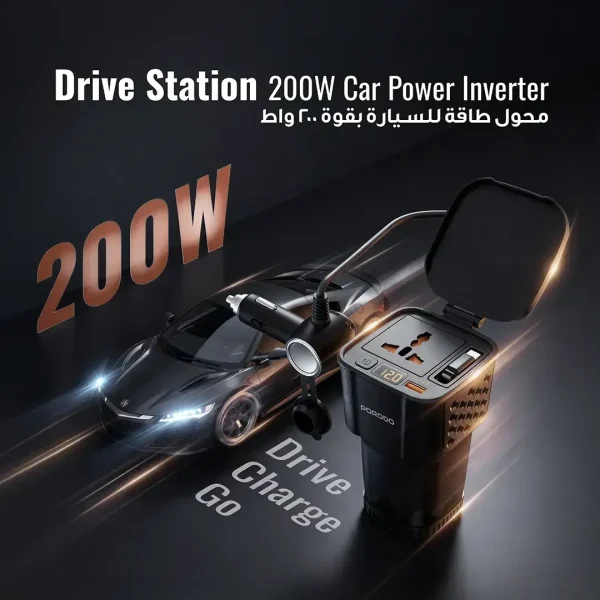 اینورتر برق خودرو Porodo DriveStation 200W با نمایشگر ولتاژ لحظهای – مشکی یک منبع تغذیه قابلاعتماد برای استفاده در سفر و داخل خودرو است.