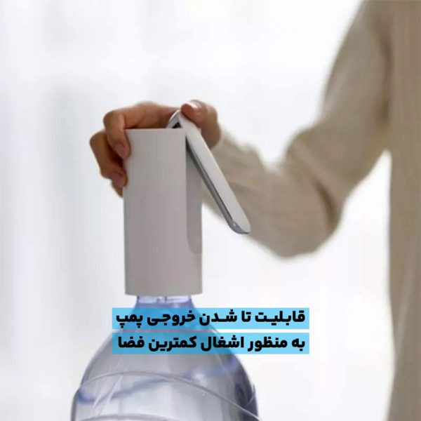 پمپ آب شارژی یک پمپ آب شارژی است که به کمک آن می توان آب را از منبع آب کوچک یا بزرگ استخراج نمود. این پمپ به کمک باتری داخلی 1200 میلی آمپر کار می کند. لوله ی خروجی این پمپ تاشو هست که حمل آن را آسانتر می کند. یک دکمه در قسمت بالایی این محصول طراحی شده است که وظیفه ی قطع و وصل کردن جریان آب را بر عهده دارد.